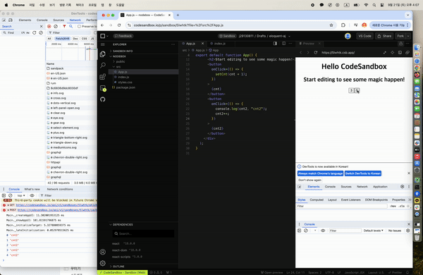 어떻게 보면 React를 그냥 따라 쓰고 예제만 할 뿐 공부가 많이 부족했던거 같다. 그래서 찬찬히 공부 https://react.dev/reference/react/useState useState – ReactThe library for web and native user interfacesreact.devuseState는 state 상태를 저장하며 변경 감지 및 UI 업데이트를 하는 역할을 한다.가령 state가 아닌 변수가 업데이트가 일어난다고 해서 바로 업데이트 되어 화면에 해당 값이 반영되지는 않는다. useState는 다음 아래와 같이 [변수, 세팅할변수] = useState(초기값); 을 통해 사용을 한다. import "./styles.css";import { useState } from..