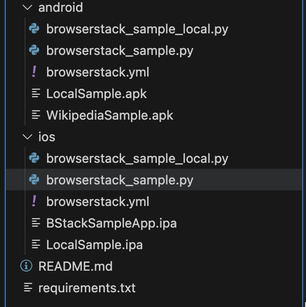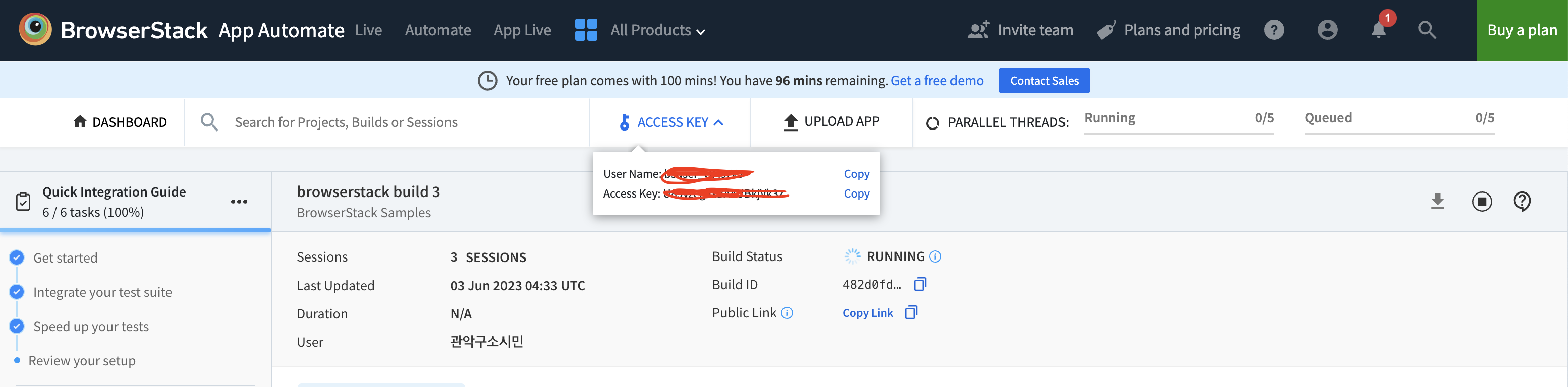 예제를 실행시키기 위해선 각 android/ ios에 있는 browserstack.yml에 있는 userName과 accessKey 를 수정해야 함.