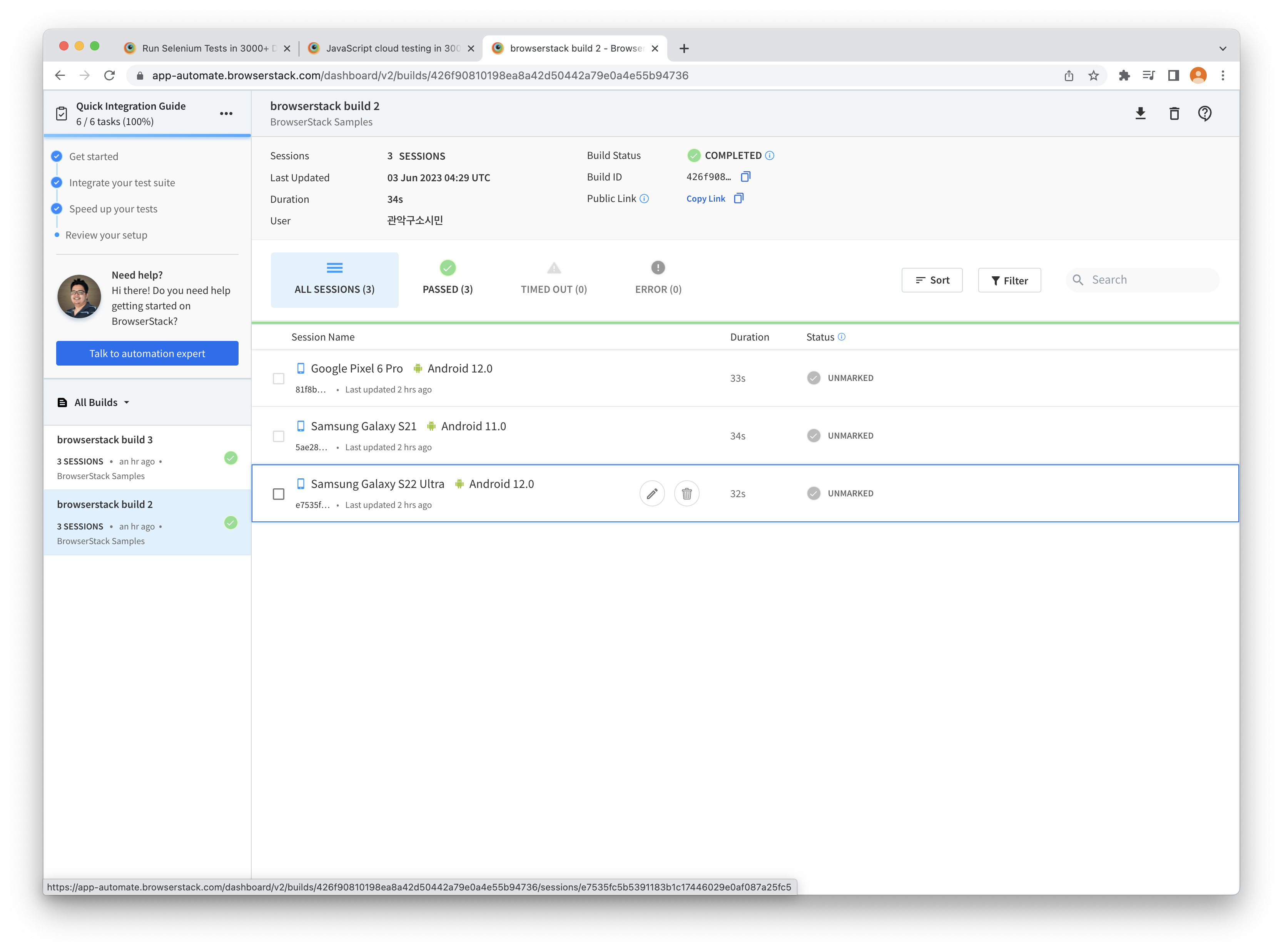 terminal에서 실행하면, 아래 All Builds에 실행 중인게 출력되며, 선택하면 디바이스마다 진행 상황이 웹으로 볼 수 있게 나온다.