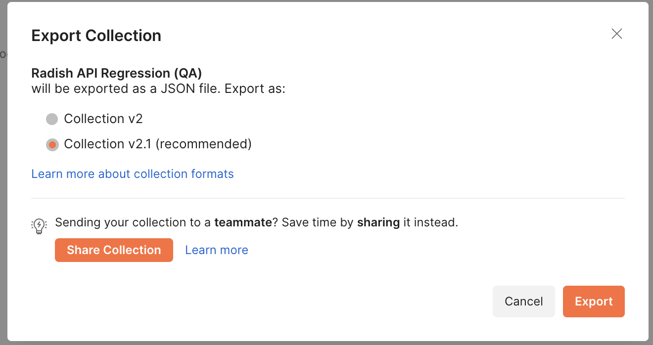 Postman GUI에서 Collection 의 메뉴 중 Export를 통해 Json 으로 된 Collection 을 다운 받을 수 있다.